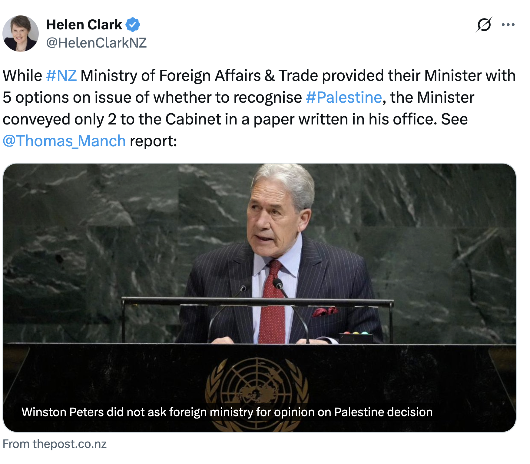 Plus: Winston Peters bypassed government officials to author his Palestine statehood cabinet paper with his staff. Foreign Minister Peters only included 2 of the 5 MFAT options