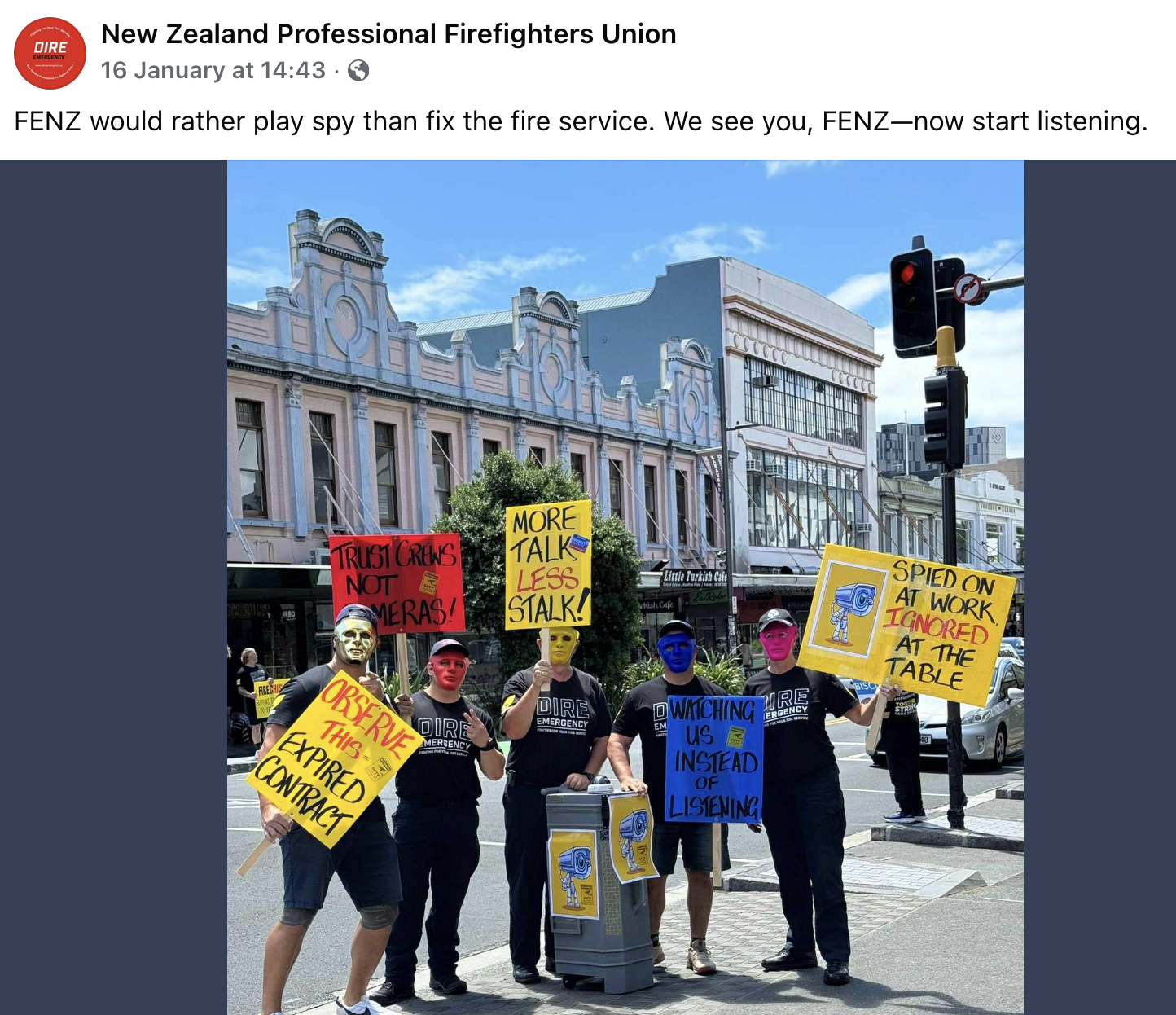 - FENZ is reportedly directing and using Auckland Transport (AT) cameras to spy on firefighters and supporters during 1 hour strike / protests. The firefighters’ union has lodged a complaint with the Privacy Commissioner but FENZ has not responded publicly. The National and ACT government, along with FENZ leadership, appear intent on attacking firefighters.