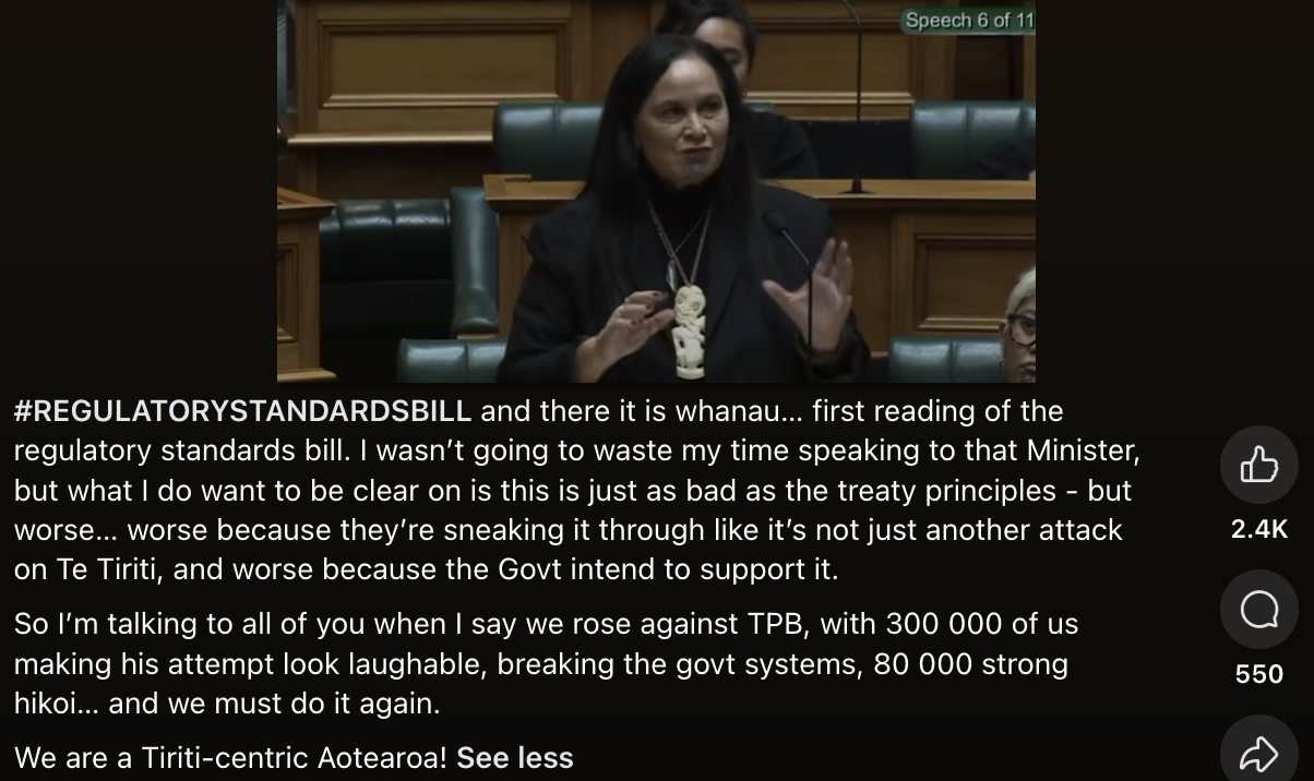 Te Pāti Māori worked consistently on the effort. The RSB explicitly excludes Te Tiriti o Waitangi from its set of “good” law-making principles and is widely seen as a ‘Trojan Horse’ attempt by ACT to, amongst other things, eliminate the Treaty of Waitangi from the country’s legal framework.