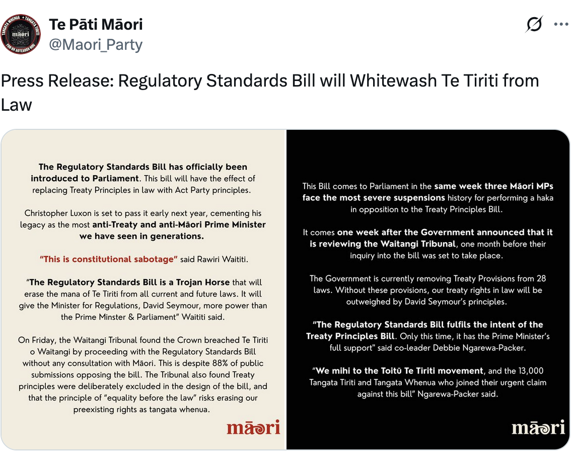 We really have to give credit to everyone that has been involved from Emeritus Professor Jane Kelsey, who was possibly the first to sound the warnings in January 2024, to who supercharged it all and we are thankful for, to Te Pati Māori and Toitū Te Tiriti2 who worked tirelessly, to ’s incisive analysis and always incredible acumen, to Greenpeace Aotearoa, Forest & Bird, the veritable Dame Ann Salmond, the Public Health Communications Centre which is always too incredible to limit by words, the great NZ unions, constitutional experts, former PMs, legal experts, media (Newsroom, RNZ, BHN etc), public health experts, scientists, economists, civil liberties groups, community groups, social service advocates, writers….there’s just too many to even try to cover.