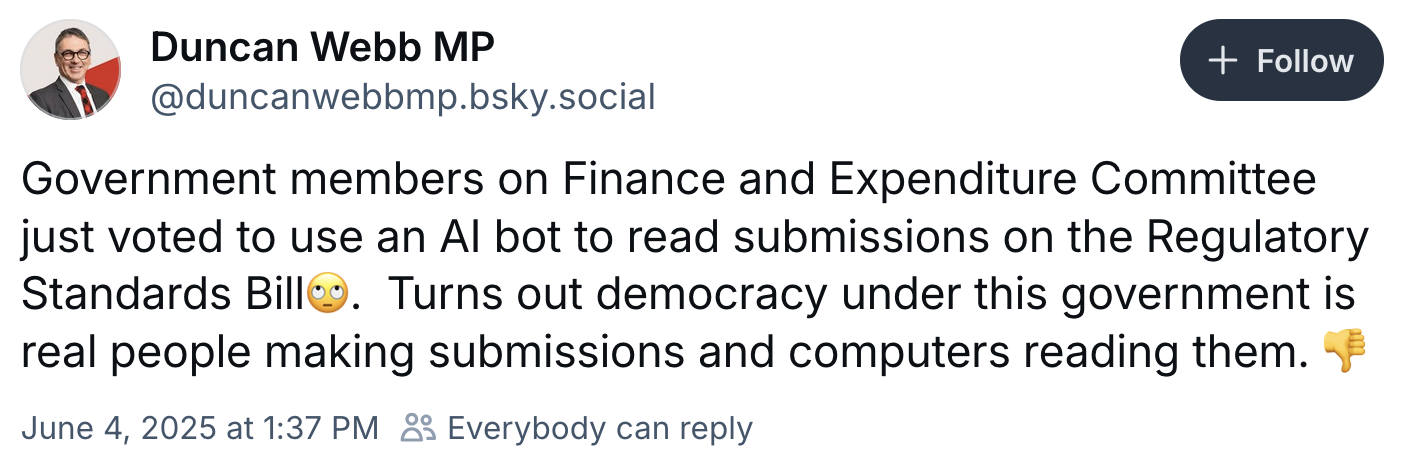 - Seymour has directed his Ministry to analyse the responses with an AI bot. We should expect to learn more about the breakdown between those in opposition of the bill, and those against. We can also review oral submissions during the Select Committe process. Won’t that be fun.
