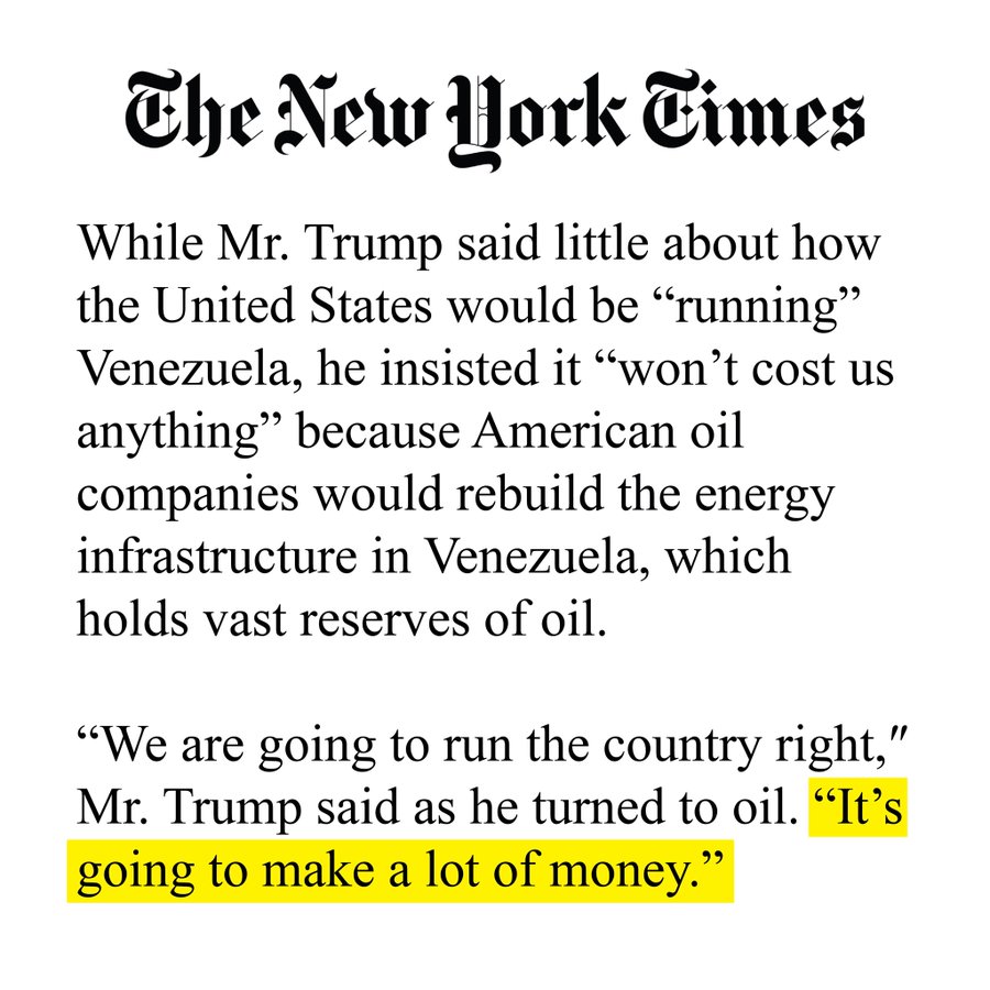 “Last year, Trump promised American oil executives “a great deal” if they donated $1 billion to his campaign. Today, he gave them Venezuela — home to the largest oil reserves in the world. This new war is not only illegal and reckless; it is deeply corrupt.”
