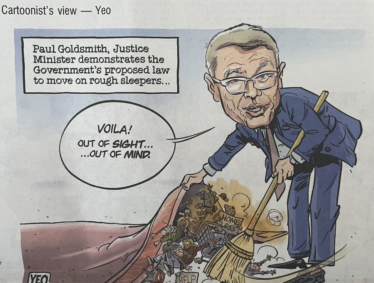 - Paul Goldsmith is the same Minister who tried to have police arrest the homeless 18 years ago, and succeeded this year.